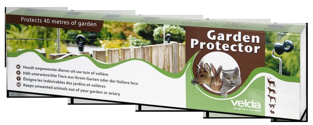 De Garden Protector van Velda beschermt 40 meter tuin of volière tegen ongewenste bezoekers met 2 draden, compleet met transformator en schrikdraad. Veilig voor mens en dier.Dubbele schrikdraad.Ongevaarlijk spanning.